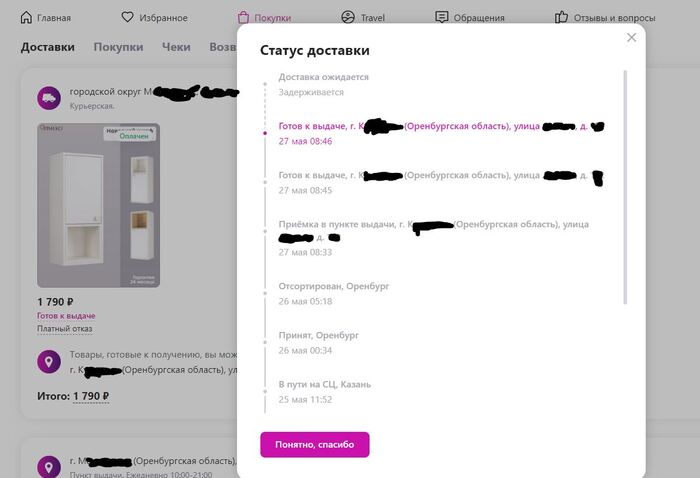 Но мы же находимся в другом городе М, зачем нам ехать в К, и заказывали мы в М. Статус Доставка ожидается как бы намекал, что всё будет вовремя.