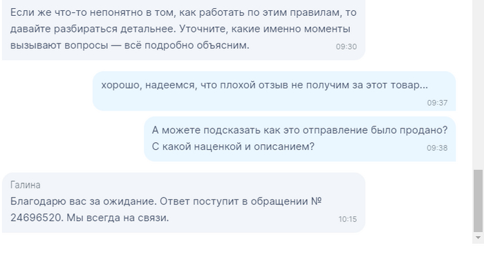 Сначала надо было проверить размеры коробок у Почты России, а не соглашаться сразу отправить в регион. Но я для себя решила, что вещь хочу быстрее сбагрить и готова купить коробку нужного размера (минус свои кровные рублики). Покупатель был крайне вежлив и расположен, так что меня удивило сообщение «клиент отказался», когда заказ не был принят. При получении возврата было обнаружено, что вещь еще немного повреждена, но там справится клей, поэтому я решила не впрягаться в разборки. Покупатель не объяснил, почему не взял, возможно, из-за этого отклеившегося элемента. Тут я сделала вывод, что всегда надо делать так, как удобно мне и не рвать попу. Это должно быть первичное условие, а соглашаться ли решит сам покупатель.