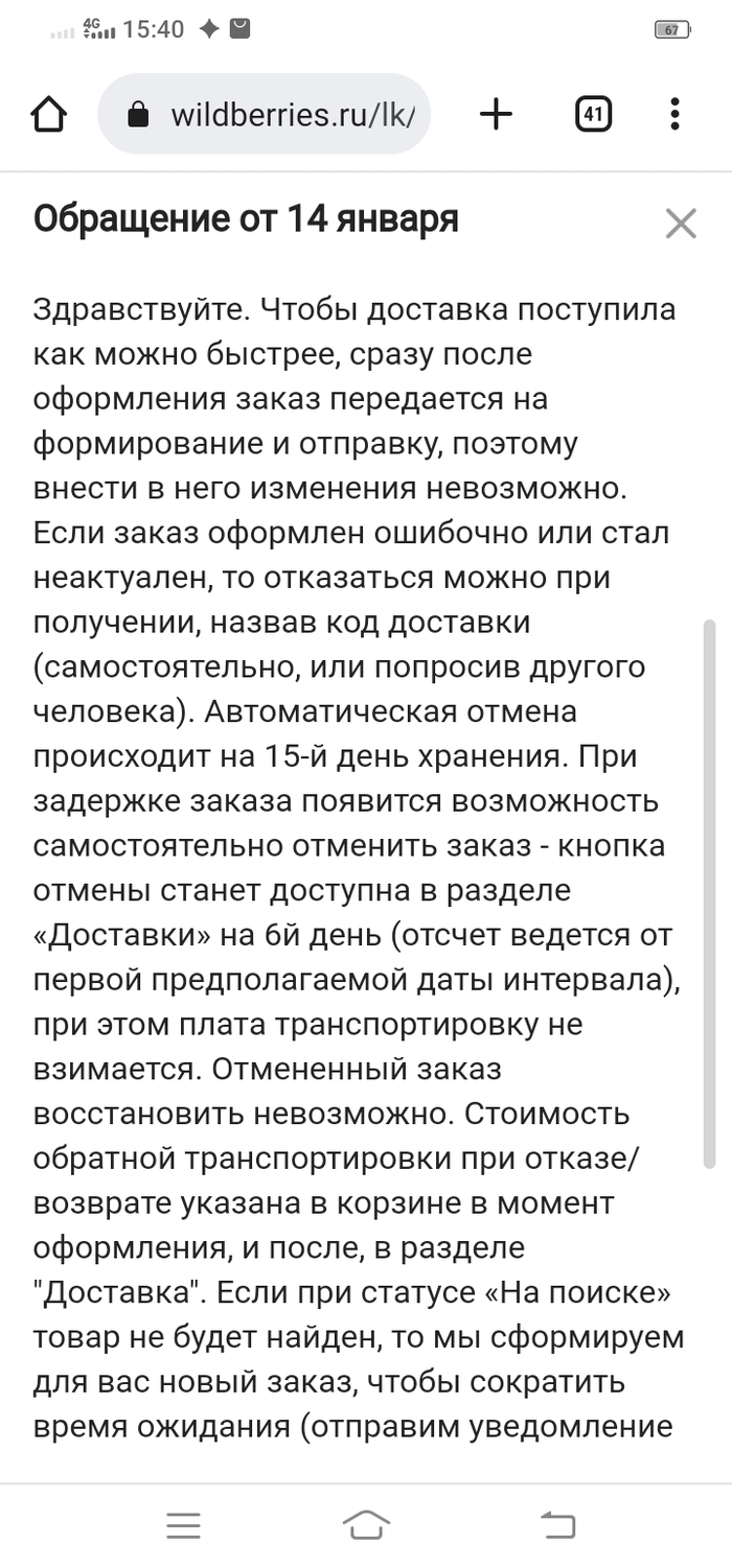 Вайлдберриз обнаглел окончательно. в открытую плюет на законодательство, ЗОПП, россиян-потребителей. Помните, раньше была возможна отмена заказа в течение 10 минут с момента оформления? Теперь и её нет.