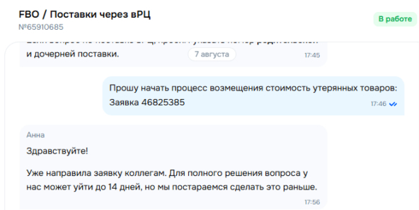 Здесь мы уже начали беспокоиться и обратились в поддержку. Ответ был очень формальный, что в течение 30 дней с момента отгрузки товар будет размещён на складе: