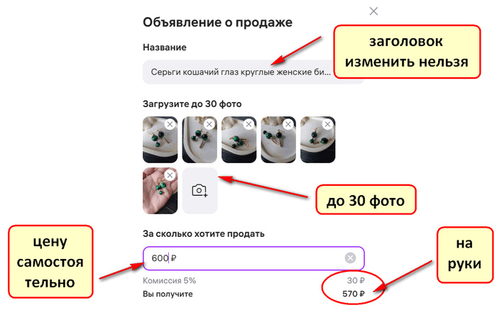 Обратите внимание, что заголовок объявления подтягивается из карточки продавца, и изменить его нельзя.