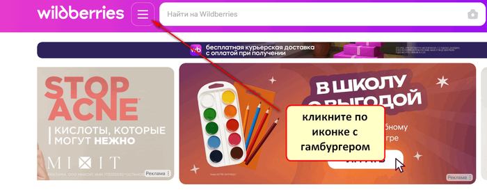1. На главной странице сайта маркетплейса рядом с логотипом Wildberries кликните по иконке с "гамбургером".