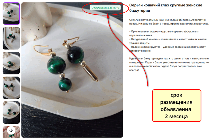 В качестве эксперимента я выставлю на продажу серьги с натуральным камнем "кошачий глаз". Я покупала их на Вайлдберриз, может быть, около года назад, но не ношу. Теперь есть повод их продать.