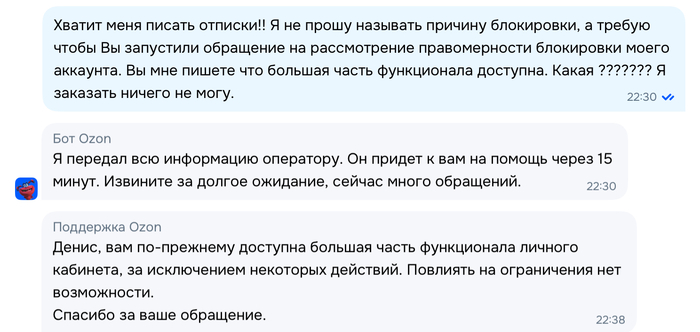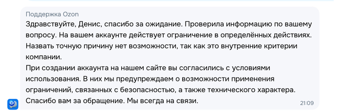 И меня еще благодарят за обращение! Заказать я ничего больше не могу! Для чего вы вообще тогда мне оставили аккаунт если функции покупки на нем больше нет, карточки товара рассматривать? Я на данный момент могу только получить уже заказанные товары. Но зачем мне это нужно конечно, с таким вашим отношением. Это ограничение определенных действий по Вашему??? Озон, это действия крупной компании по отношение к своим постоянным покупателям, которые приносят Вам деньги?????? У меня аккаунту более 10 лет!!! Или может быть я покупал у Вас товар по акции со списанием баллов и перепродавал его?! Да нет у меня таких заказов и Вы это видите!!! Я просто хотел сэкономить, участвуя в Вашей же официальной акции баллы за отзывы. С которой Вы зарабатываете!!! Вы что за дичь полнейшую вытворяете?????????? Вы конечно грамотно все сделали, и меня кинули ни за что и продавцов с которых деньги уже за оставленные мною отзывы списали. И я уже потратить накопленные баллы не смогу. МОЛОДЦЫ!!