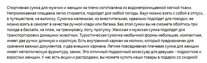 Как я уже написал – встретить что-то прям плачевное почти не возможно. ЯМ не пропустит, и всё-таки минус есть: описания иногда превращаются в сплошные характеристики и перестают быть “живыми”. Но это только плюс для моих карточек – значит мои сумки будут впереди.