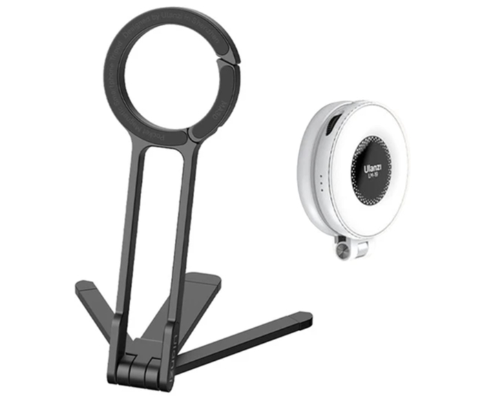 Штатив Ulanzi MA30 совмещает крепление для телефона, встроенный светодиодный модуль и карабин для переноски. Конструкция складного типа облегчает хранение и транспортировку.