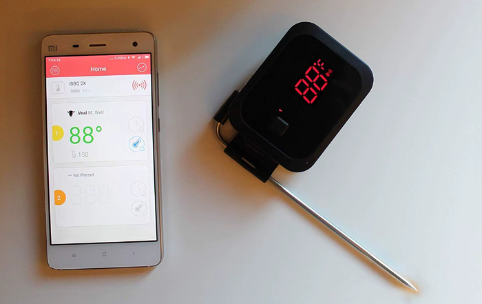 Беспроводной термометр с двумя датчиками, предназначенный для контроля температуры мяса и гриля во время приготовления барбекю. Передает данные на смартфон через Bluetooth, позволяя отслеживать процесс на расстоянии.