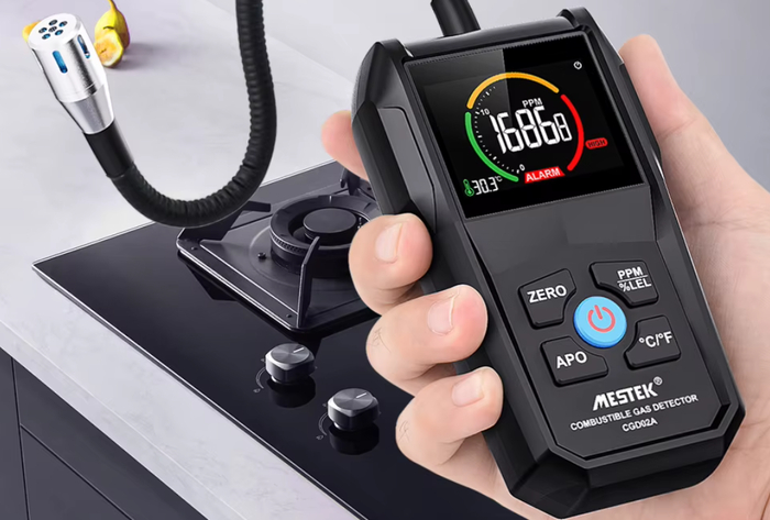 Точный прибор для определения утечки газа в помещении. Обнаруживает бытовой газ, пропан, метан и другие. Оснащён дисплеем и сигнализацией.