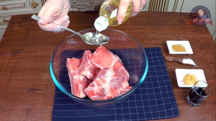 Приготовим маринад для свиных ребрышек. К мясу влить 3 ст. л. растительного масла. Обмазать им каждый кусочек. Затем добавить соль, приправу для мяса, горчицу и перемешать. Влить соевый соус. Масло, как мы знаем, будет отличным проводником специй в свиные ребра. Обмять каждый кусочек ребрышек, чтобы хорошо проник маринад. Оставить мариноваться при комнатной температуре минимум на 1-2 часа. Или сделать с вечера и убрать в холодильник.