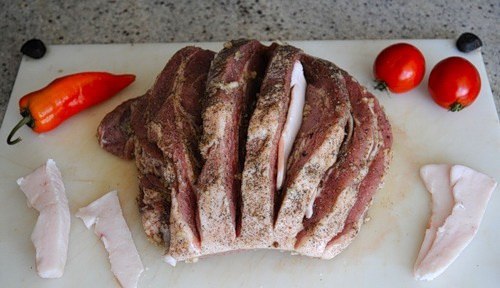 4. В каждый надрез выложите тоненький ломтик сала или бекона.