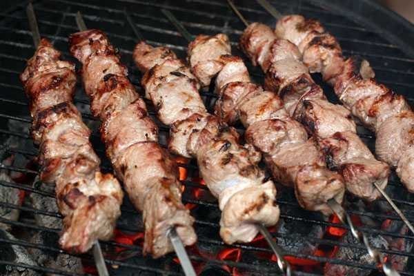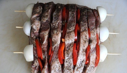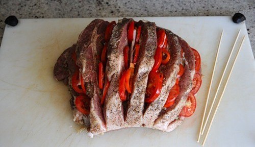 7. Чтобы в процессе запекания корейка не потеряла форму, закрепите ее палочками для шашлыка. На края можно нанизать половинки лука.