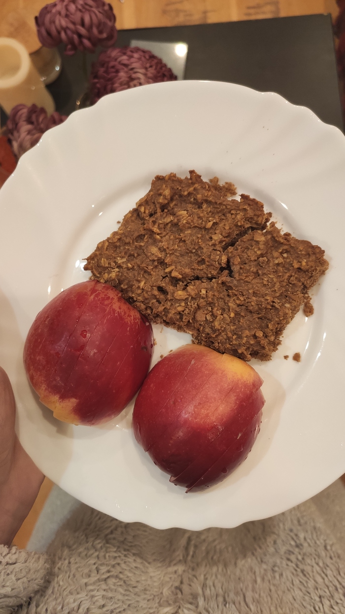 Завтрак: запеканка из овсянки (сложные углеводы) с арахисовой пастой, яйцами (белки) и какао + яблоко. Овсяные хлопья берем долгой варки, можно предаварительно их замочить на пару часов.