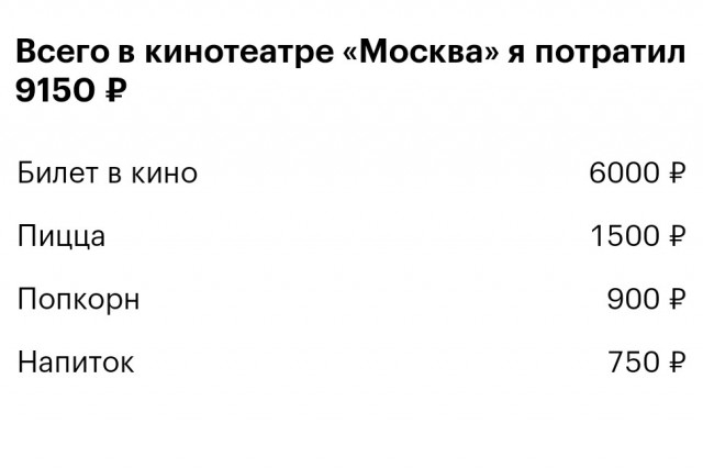 А недавно узнал, что один из самых дорогих кинотеатров России «Москва» запустил акцию. Раньше туда можно было попасть только по клубной карте с депозитом в 50 000 ₽. Но до конца лета любой зритель может один раз купить билет по обычной стоимости — от 5000 до 6000 ₽.