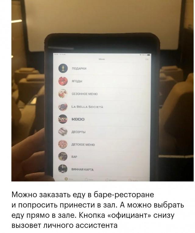 У залов расположен бар-ресторан. Именно там клиентам выдают специальный планшет. В нем — цифровое меню. Позиций не так много, но они очень разнообразные: от сувениров до попкорна с добавлением корицы.