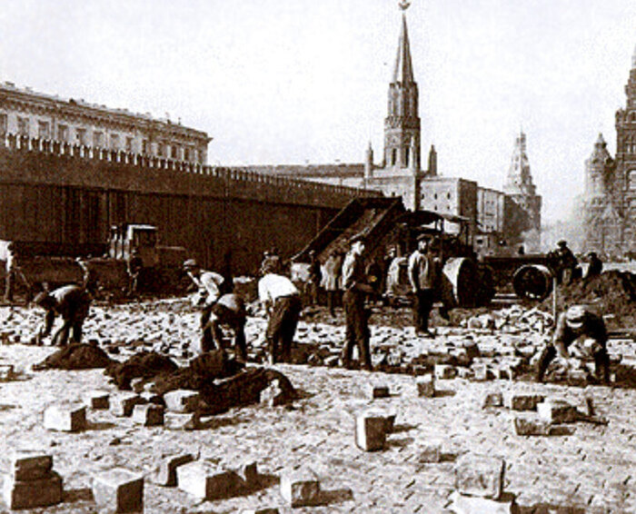 А когда же появилась знаменитая "брусчатка"? Совсем скоро после того самого парада – в 1930 году. Вот на этой фотографии Красную площадь наконец-то мостят "как следует":