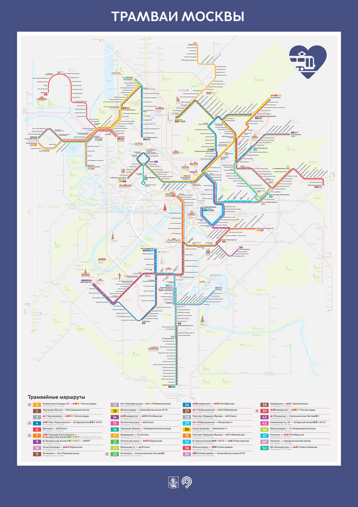 🔹 По ней легко и удобно ориентироваться — помимо маршрутов трамваев нанесли на схему линии метро, МЦК и МЦД, вокзалы, основные магистрали и парки.