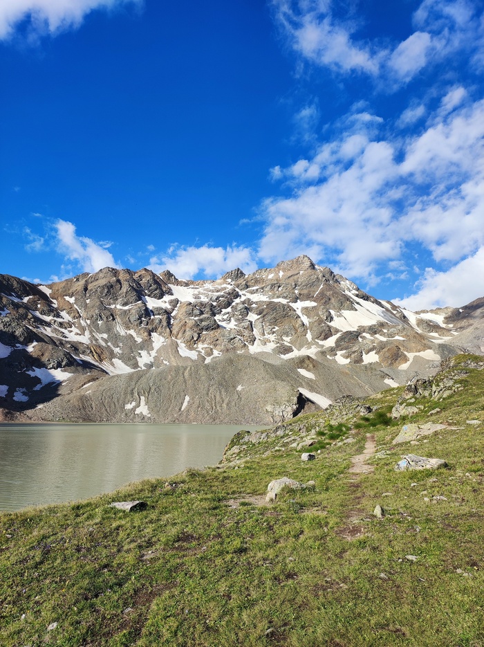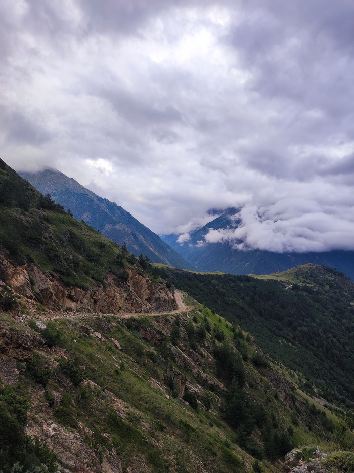 Сегодня наша задача пройти до верхних Кармадонских ванн. Расстояние до них от погранцов 7 км, с набором 640 метров. Дорога в целом приятная, переодически с крутенькими подъемами и выполаживаниями после них. Вся промаркирована красными флажками, поэтому там сложно заблудиться. Флажки кстати, устанавливают перед ежегодными забегами на Казбек, рекорд забега 4:00:26.
