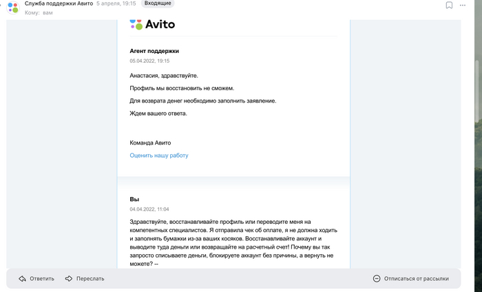На это сегодня я ответила в очередной раз, разборки уже превратились в какой-то прикол. Очень любопытно, как долго это продлится, у меня уже определенный азарт на этих мошенников, авось через месяц-другой приложу еще скриншотов, как авито ничего не могут))