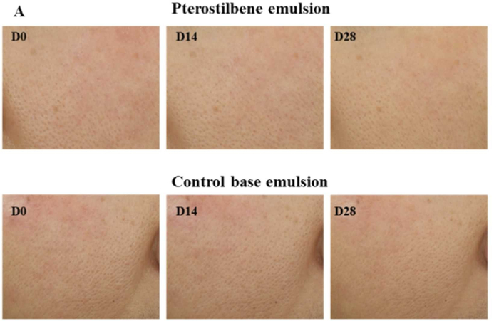 В исследовании принимал участие 31 пациент (мужчины и женщины), от 32 до 53 лет с выраженными возрастными изменениями кожи лица: провисаниями , морщинами и снижением эластичности. В течении 28 дней подряд испытуемые дважды в день наносили на половину лица контрольную эмульсия и эмульсию с птеростильбеном.