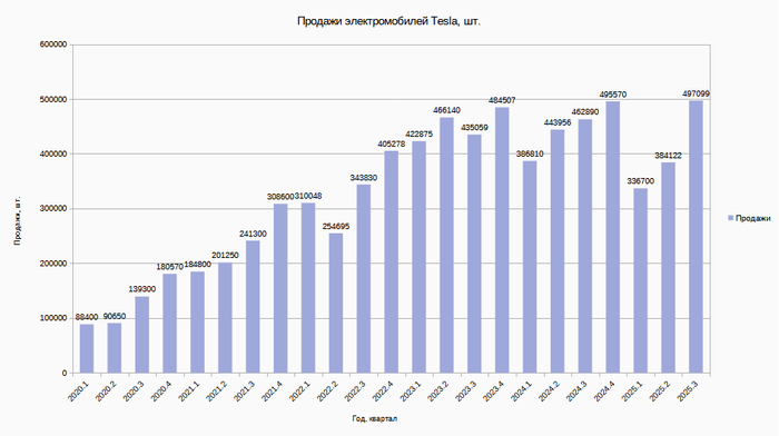 Квартал действительно рекордный, лучше у Tesla дела шли в 4 квартала 2024 года, когда удалось продать 495 570 автомобилей: