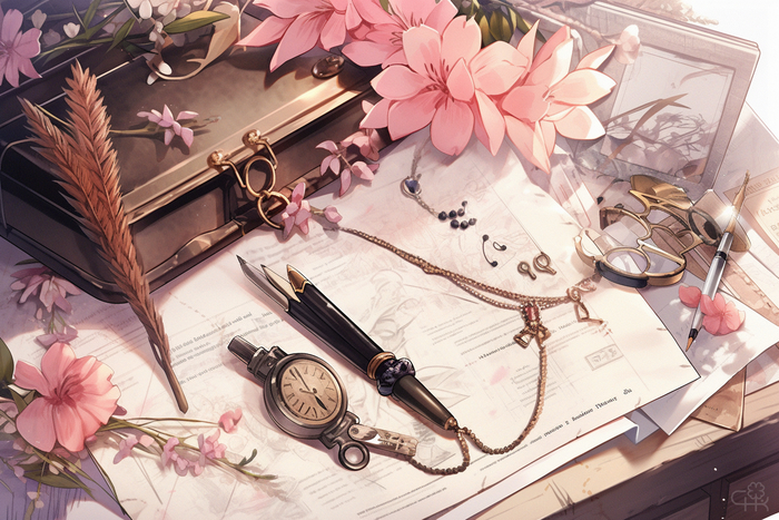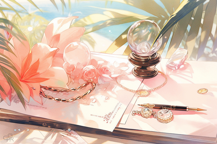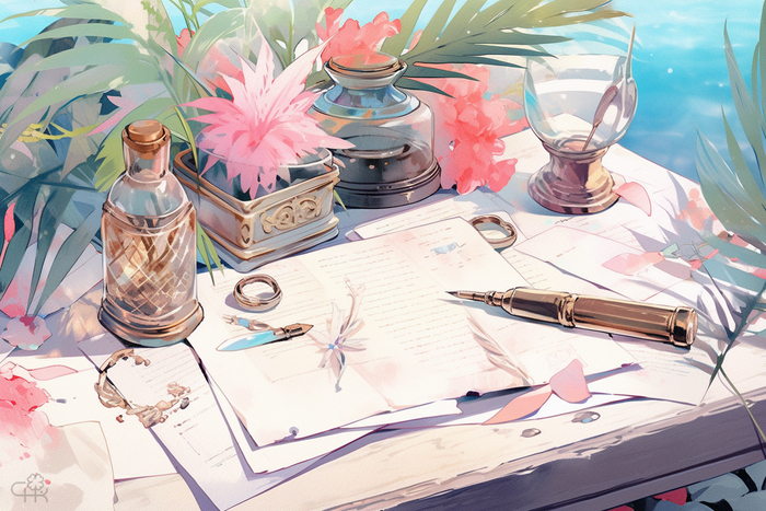 Промпт: unfinished letter on desk, pen and inkwell, dried flower, pink ribbon, necklace and ring, palm leaves, open window, sea breeze, watercolor illustration, postcard, watercolor art
