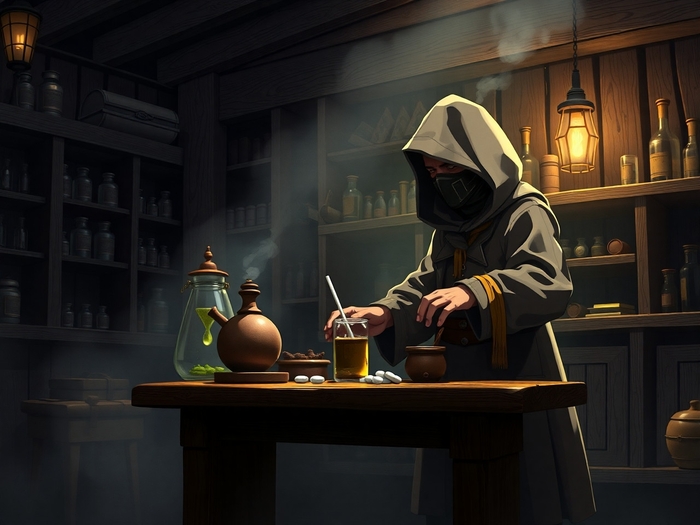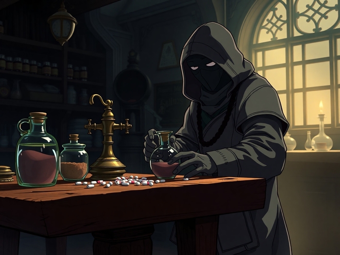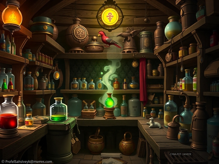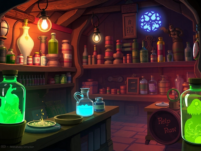 Он направился вглубь аптеки, я последовал за ним. Внутри было темно и тихо, только слабый свет от свечей освещал полки с разнообразными зельями, мазями и порошками. На стенах висели пучки сушеных трав, источающих легкий аромат.
