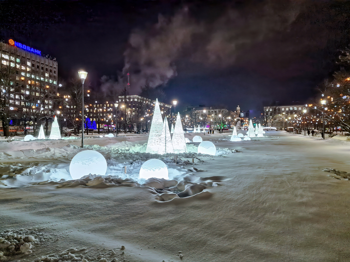 Похоже, на этом кролики закончились. Но не закончились интересные места. На месте сухого фонтана организовали детскую площадку с сугробами-тоннелями. И всё это освещается по-новогоднему украшенной шишкой.