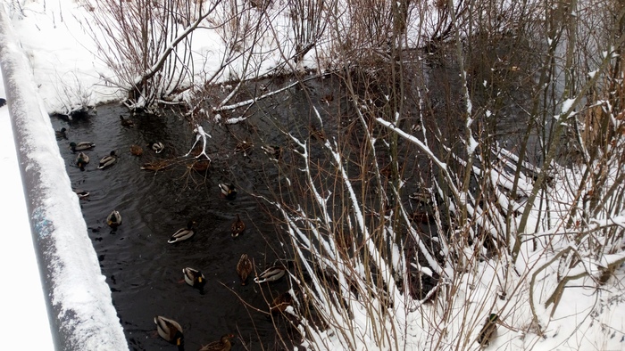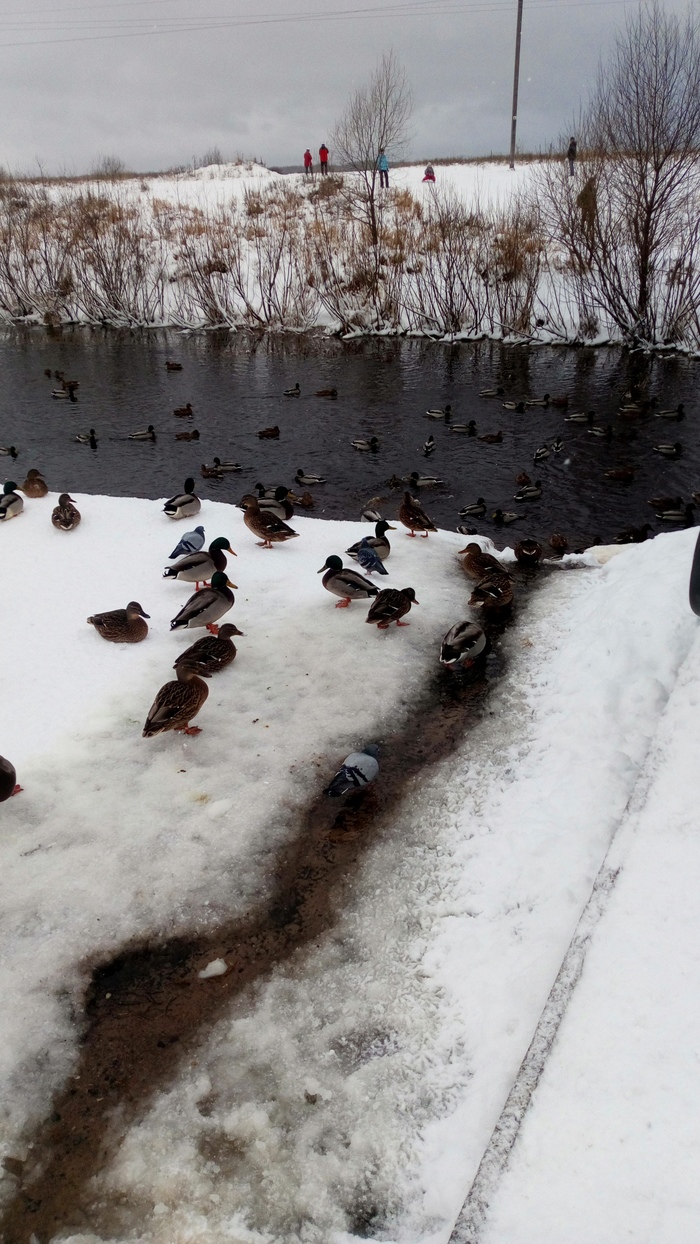 В нашем городе не первый год дикие утки остаются зимовать. Теплые зимы и регулярное кормление сострадательными горожанами "приручили" уток. Сегодня прогуливался с детьми по Веряжскому парку и у речки Веряжи сделал данные фотографии. Уток много, причем это не одно место где они "тусуются". Наверно еще в трех местах на речке Веряжа можно увидет такое количество уток (50-60 особей). Мне интересно, только в нашем городе такое происходит? Или утки как голуби и чайки становятся городскими птицами?