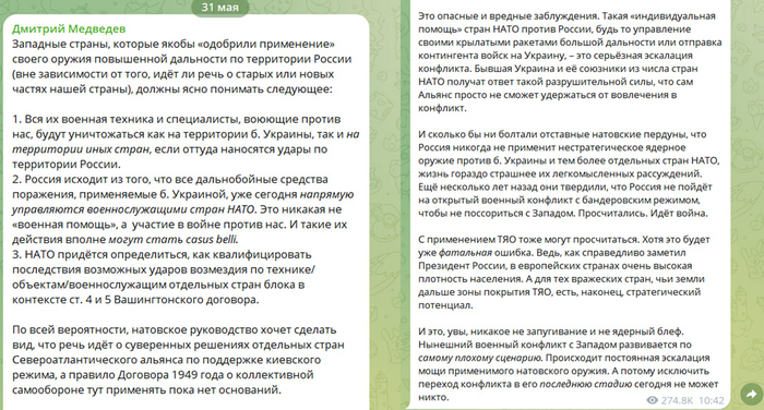 Но будет ли ответ РФ? Давайте посмотрим, пока никакого крупного применения западного оружия по территории России не было, но если оно произойдёт, то правительству всё же придётся отвечать. (Как в той ситуации с Ираном и Израилем)