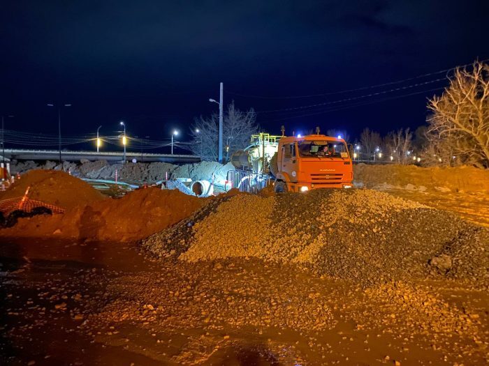 В Оренбурге строители всю ночь вели работы по укреплению дамбы у берега Урала в районе улицы Черепановых. Главная цель дамбы — спасти исторический центр и Аренду от большой воды.