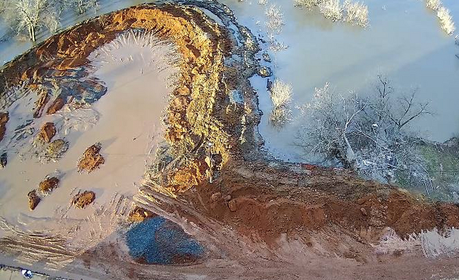 К дамбе свозили землю и глину. Площадь дамбы существенно увеличилась. Рядом земляные работы вели у канализационных люков, вода из них шла на поверхность земли.
