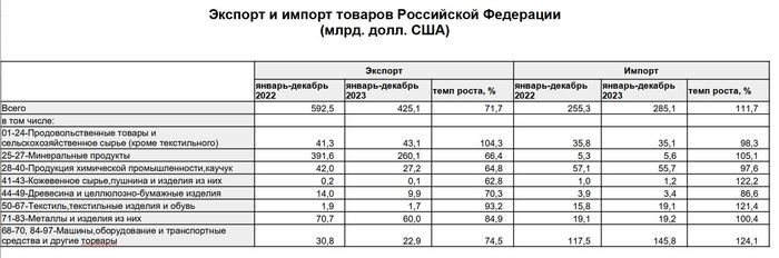 Импорт почти догнал докризисный показатель — не хватило всего 3,7%, которые наверняка удалось бы достичь, если бы ЦБ не решился охладить экономику повышением ключевой ставки. Экспорт по сравнению со стабильным 2021 годом просел на 13,8%. Есть ещё один показатель, который важен для экономики, это сальдо торгового баланса: в 2023 году оно составило 140 миллиардов, в 2021 году — 197. Сальдо напрямую влияет на курс рубля: чем оно меньше, тем меньше валюты поступает на биржу, тем большее её дефицит и тем слабее национальная валюта.