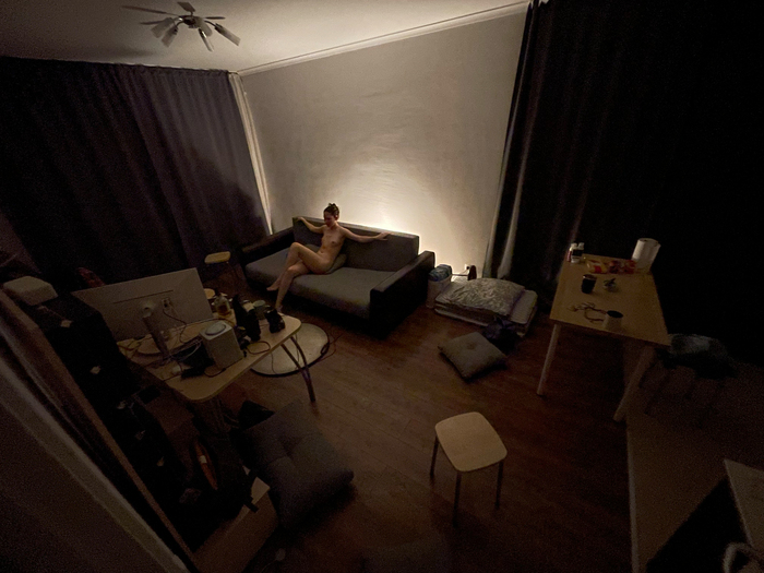 На этой съемке Аня сильно опоздала (на 2+ часа), и после пары часов съемки стало уже слишком темно. Мы сделали перерыв на еду, и стали ждать, пока стемнеет окончательно, чтобы можно было начать снимать с искусственным светом. Т.к. вспышек у меня нет, дома я использую свет торшера из Идеи за 1300р)) Пока ждали, посмотрели фоточки, обсудили. Даже успели выбрать несколько на ретушь.