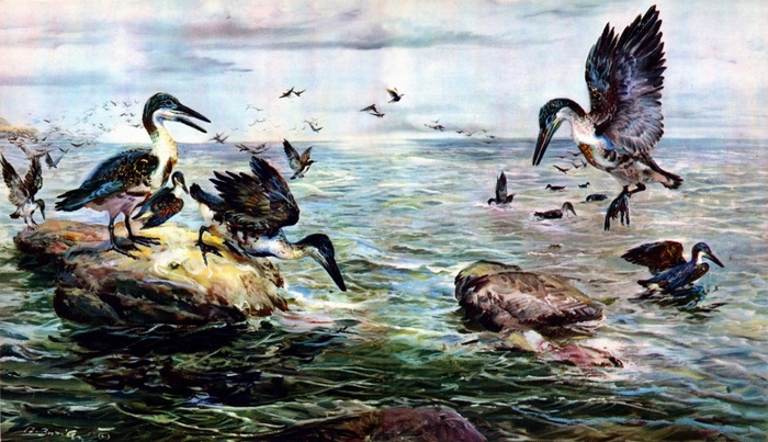 P.S. Рассказ содержит палеонтологические неточности. Картина Зденека Буриана изображает верхний мел мезозоя. Птица Ichthyornis dispar , к примеру, жила в сеномане мела. У меня действие рассказа разворачивается раньше, в апте мелового периода, поскольку аптскими выходами славится Саратовская область, и мне приходилось контактировать с этим геологическим веком напрямую. Поэтому заявлено, что речь идёт о некоем не сохранившемся в окаменелом состоянии виде ихтиорнисов. Проник в рассказ и ютараптор из барремского века мела. О некоторых животных пришлось высказаться расплывчато: "птерозавр". Не говоря уже о людях в мезозое. Впрочем, художественные изображения доисторических времён любят грешить смешением видов, не являвшихся "современниками" друг по отношению к другу, я, по крайней мере, попытался собрать в аптском веке животных, которые гипотетически могли собраться там вместе. Перемешаны также оказались просторы нынешних Евразии и Северной Америки, впрочем, тут у меня есть оправдание: тогда это был единый континент - Лавразия. Неизвестно науке также ничего о морских насекомых семейства Chresmodidae, но я могу гипотетически предположить существование таких форм, поскольку занимающие в наши дни похожую экологическую нишу клопы-водомерки могут прыгать как по поверхности рек, так и по волнам открытого океана.