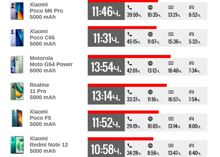 В Poco M6 Pro установлен довольно емкий аккумулятор 5000 мАч. Телефон показал неплохие результаты в нашем тестировании аккумулятора. Ничего впечатляющего, но все же результат достойный. Он находится примерно на одном уровне с другими бюджетными устройствами с такой же емкостью аккумулятора. Средний балл за активное использование у него выше, чем у Poco C65 и Poco F5. В Poco F5 установлен чипсет Snapdragon 7+ Gen 2, а в Poco С65 - чипсет MediaTek, как и в M6 Pro, но менее производительный - MediaTek G85. G99 использует довольно современный 6-нм техпроцесс TSMC, который более энергоэффективный.