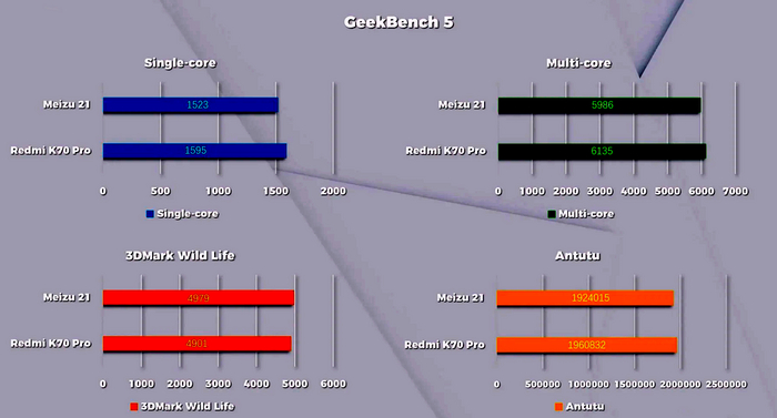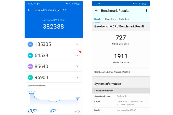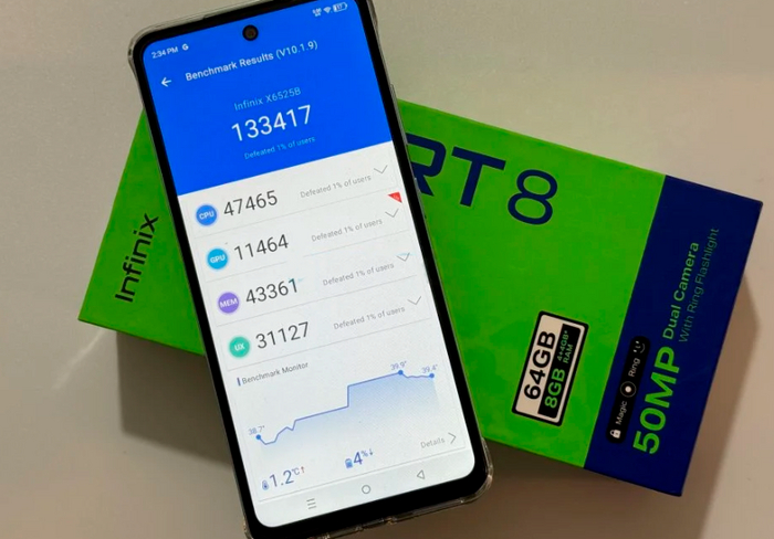 AnTuTu - более сложный бенчмарк, который учитывает такие параметры, как память, хранилище и GPU. Телефон показывает средние результаты для этого процессора.