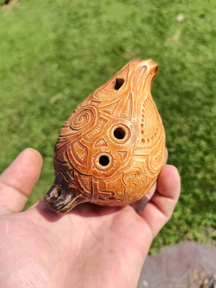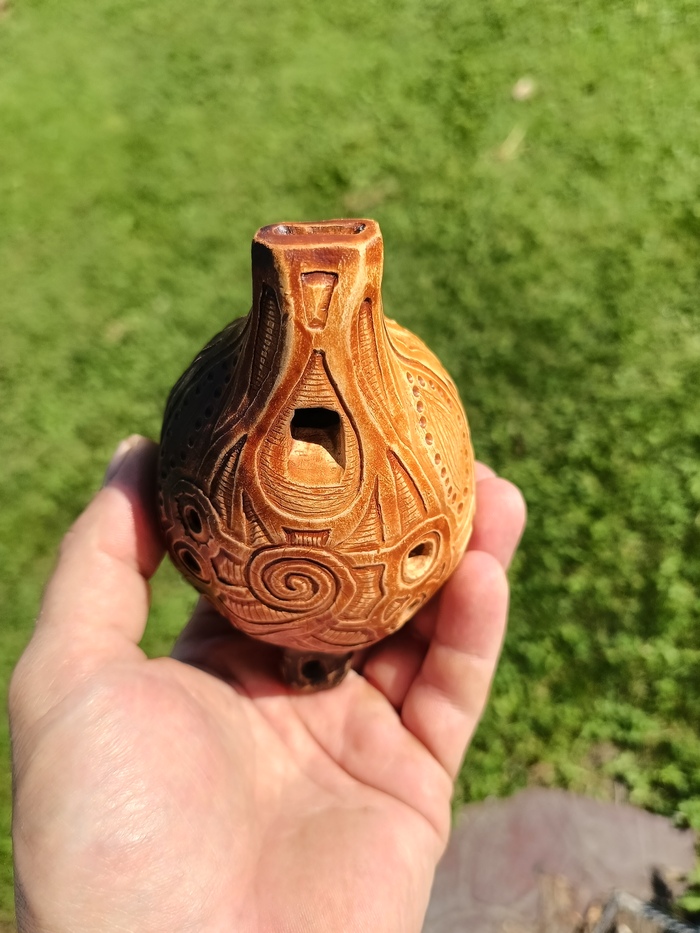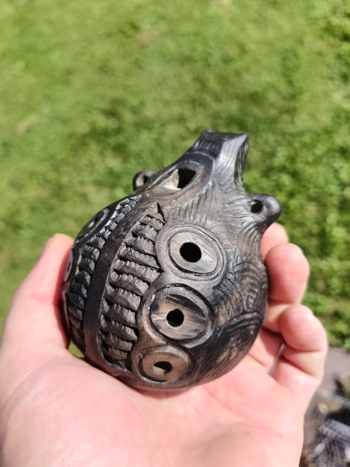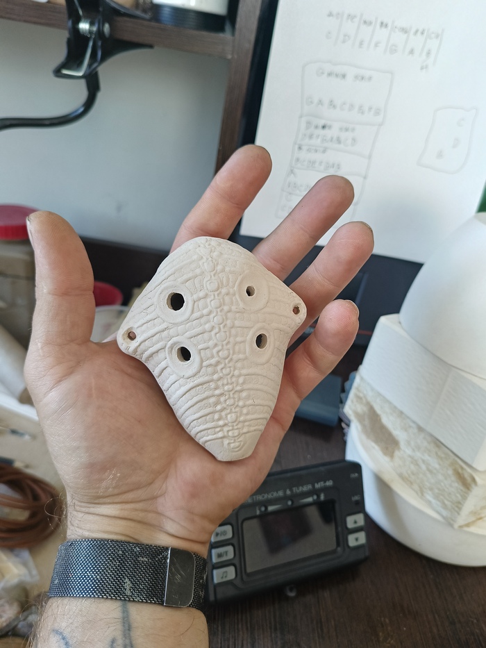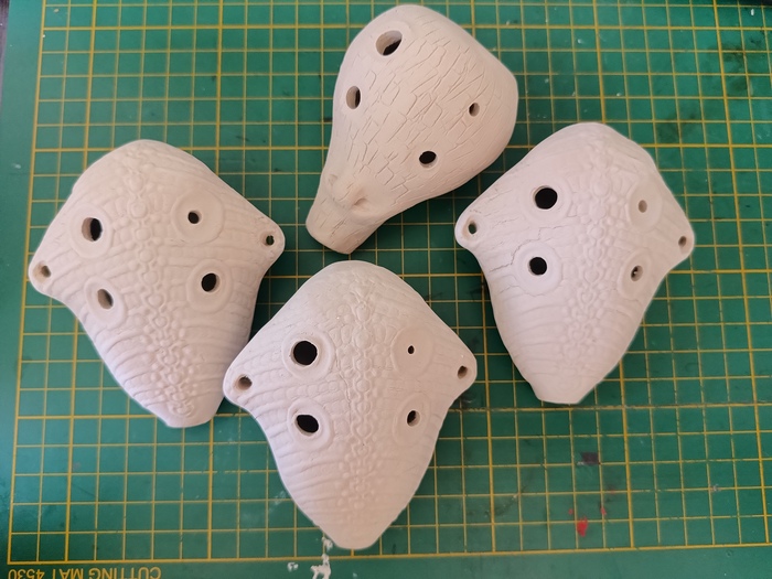 Не обожжённые ещё, сохнут пока, думал как сделать одинаковые плюс минус по звучанию и декору, вроде получилось, главное чтоб не лопнули. Окарину на 4 отверстия обычно называют окариной Джона Тейлора, воспроизводит приличное количество нот несмотря на кажущюяся простоту. Глина уральская 31/1 называется, производитель Витольдглина помоему.