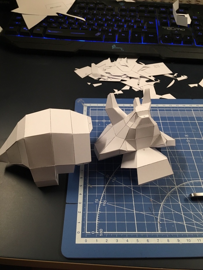 - Неудачный выбор бумаги - мне нужна была чистая белая бумага и много, я по старой привычке взял набор бумаг для заметок, увы бумага оказалось просто ужасной. Будь она немного хуже, сошла бы за туалетную. После склейки бумага распадалась на слои, причём постоянно. Клеить с помощью неё мелкие детали оказалось почти невозможным. За всё время существования фигуры, когда её полностью сделал. Она неоднократно теряла свои конечности: уши, руки, пальцы и т.д.