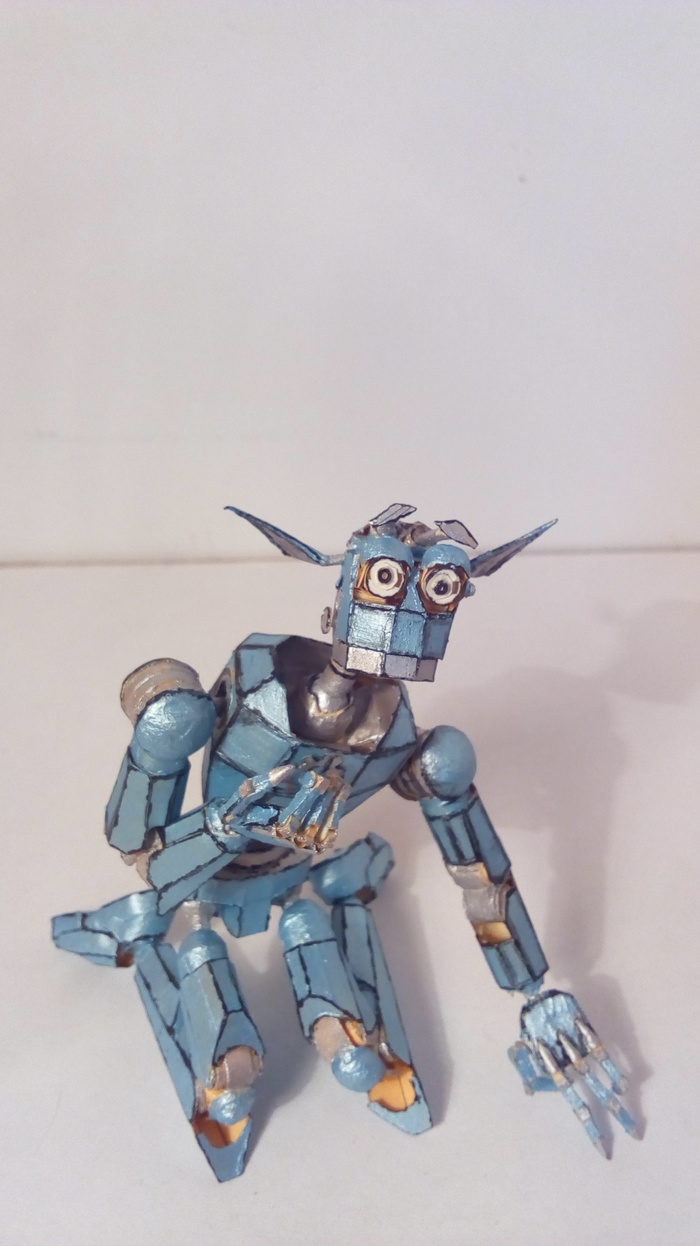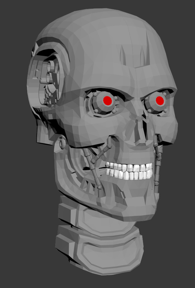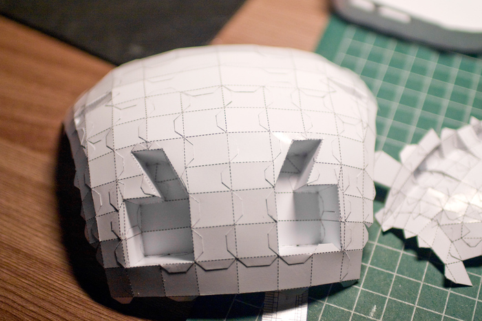 Перед экспортом в пепакура дизайнер убрал часть мелких углублений и ямок с лицевой стороны. Решил, что их будет легче выточить гравером/дрелью на уже укрепленной мастер-модели. Мало смысла клеить из бумаги гидравлику управления нижней челюстью и мелкие приводы у глаз — проще выточить на станке из пластика или склеить из ПВХ/оргстекла.