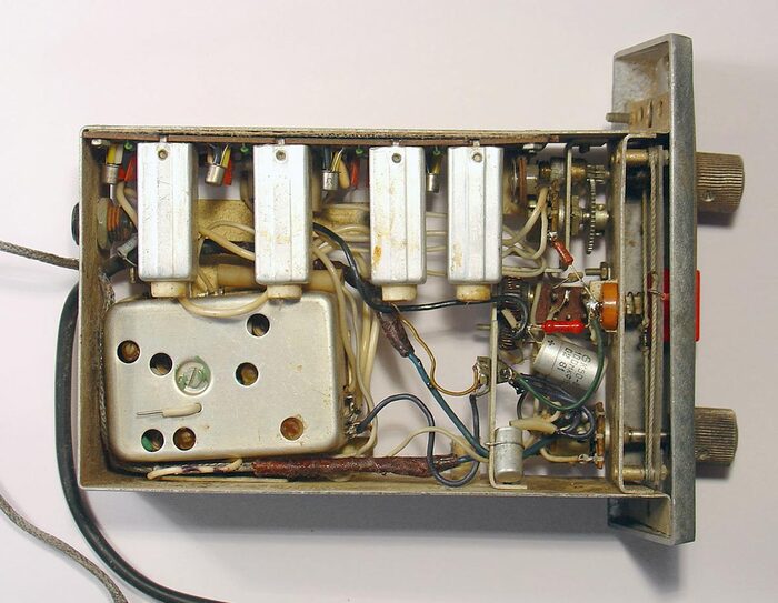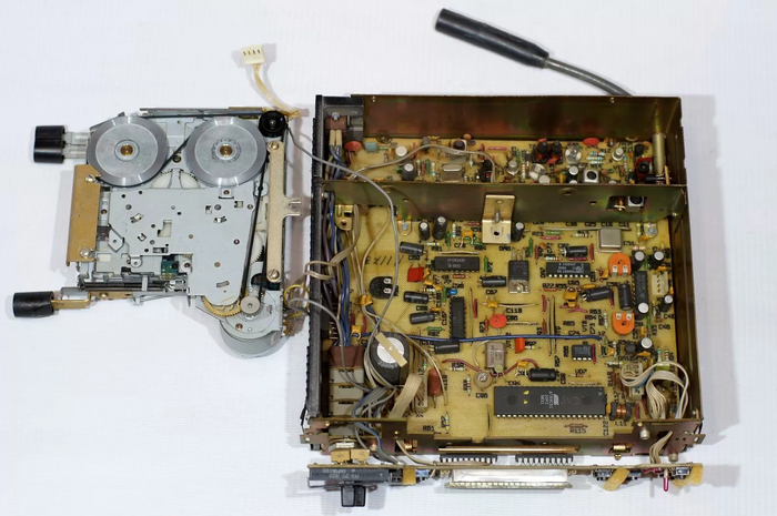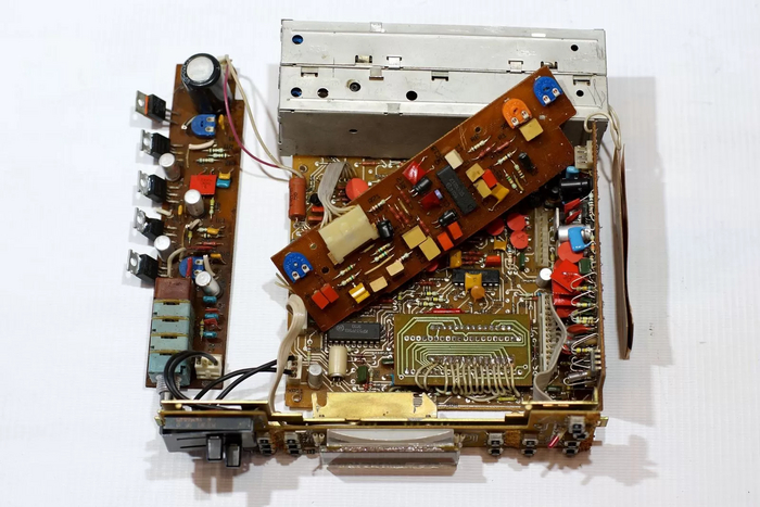 Несколько плат установлены на центральной материнской плате, включая два отдельных радиоприемных модуля для FM и AM в огромных экранированных блоках, несколько плат подключены к материнской шлейфами, но стоят отдельно, множество соединяющих проводков. Нагромождение архитектуры – сложнейшее для бытовой техники такого уровня, которая была обязана быть недорогой.