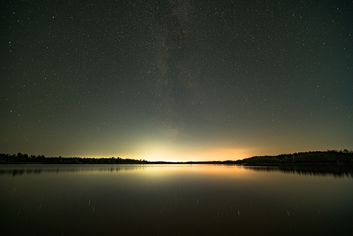 Нашел, как казалось, перспективную локацию для съемки ночного неба. По задумке Млечный Путь должен быть посередине водоема, а звезды отражаться в зеркале воды. Долго ждал нужного стечения обстоятельств, - чистого неба, штиля по ветру и отсутствию луны. Дождался. Место нашел - можно подъехать на машине к самому берегу.