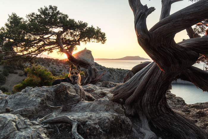 Собака-провожака среди можжевельника. На рассвете в Новом Свете нас сопровождала собака. Она не просто шла рядом, а уверенно показывала нам тропы к самым интересным местам. Вместе мы прошли от входа в заповедник до Пика Космос и обратно. Такие дела.