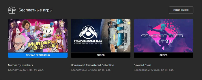 В цифровом магазине Epic Games Store забрать бесплатно в свою библиотеку до 18.00 (МСК) 27 июля можно приключенческий детектив с головоломками Murder by Numbers. После этого раздавать будут космическую стратегию Homeworld Remastered Collection и экшен Severed Steel. Если же у вас не РФ аккаунт, то сейчас можно забрать и MMORPG The Elder Scrolls Online.