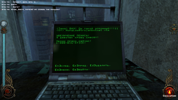 Чёртовые спамеры, которые присылают рекламу уже в виртуальные компьютеры:) Ну на самом деле это фишка игры: для ввода пароля, или команд нужно печатать на настоящей клавитуаре. Ну когда вам надоело слушать новости и радио, а также читать 4 письма в ноутбуке, выходите на улицу