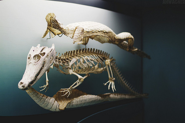 Разделение настоящих крокодилов и аллигаторов произошло во второй половине мелового периода. В кампанском ярусе в канадской провинции Альберта обнаружили останки самого древнего известного аллигатора — Leidyosuchus. Чтобы оценить размеры первого аллигатора, приведу длину его черепа — около сорока сантиметров. Это, в принципе, вполне сопоставимо с размерами современных миссисипских аллигаторов.