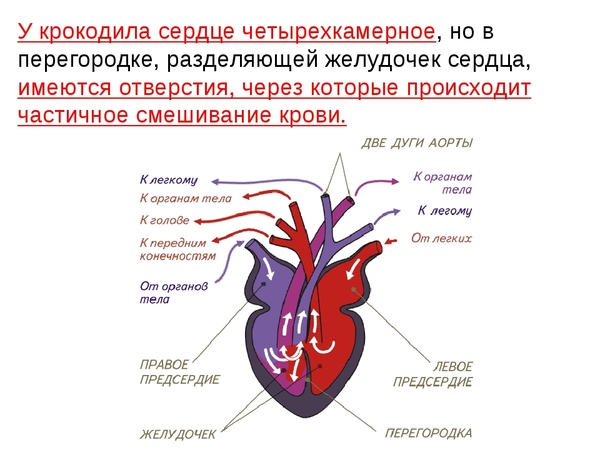 Крокодилы — единственные из известных нам рептилий, кто обладает четырехкамерным сердцем. Орган имеет по два предсердия и желудочка, полностью разделенных перегородкой. Артериальная и венозная кровь смешиваются через паннициевое отверстие.