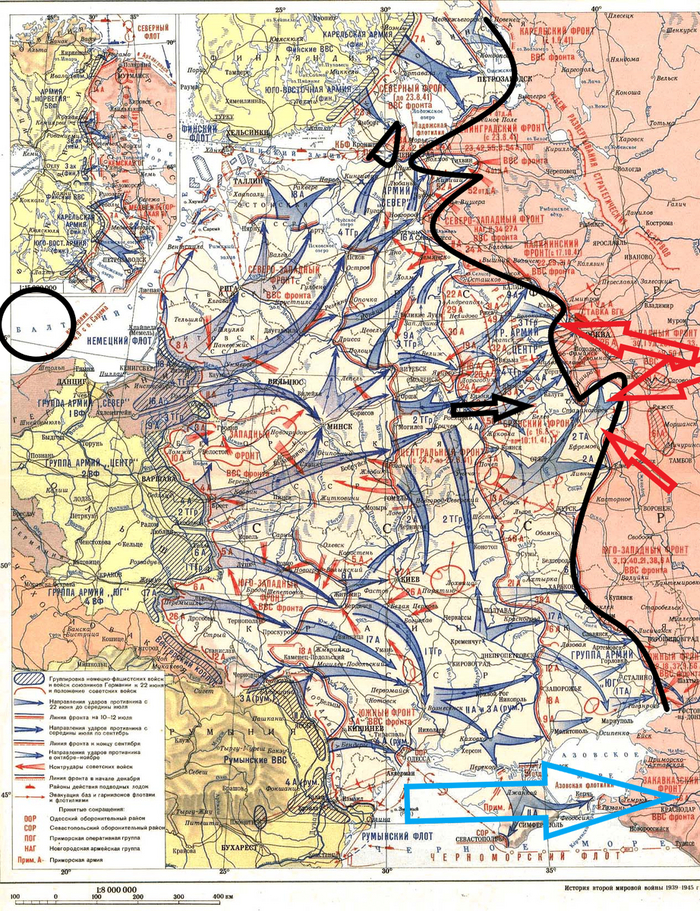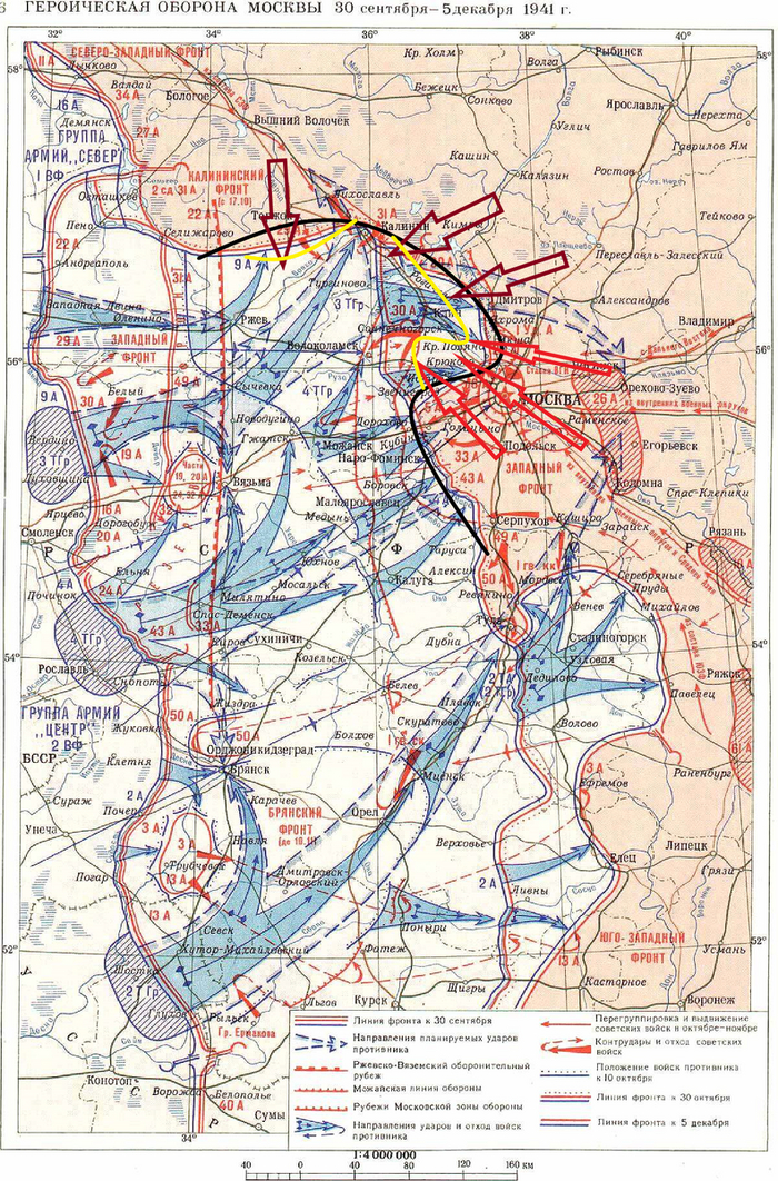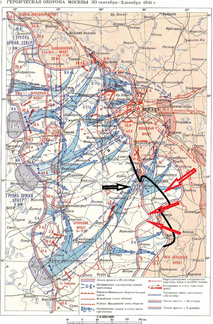 Тёмно-красным направления ударов советских армий, перешедших в наступление 5-6 декабря, красным 7 декабря.