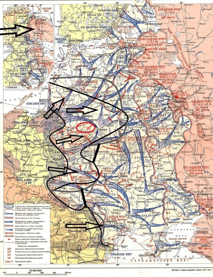 На картах красными стрелками обозначены основные удары советских войск, чёрными немецких и их союзников, голубыми направления основных событий на других театрах военных действий, жёлтыми границы отвоёванных территорий при наступлении той или другой стороны.