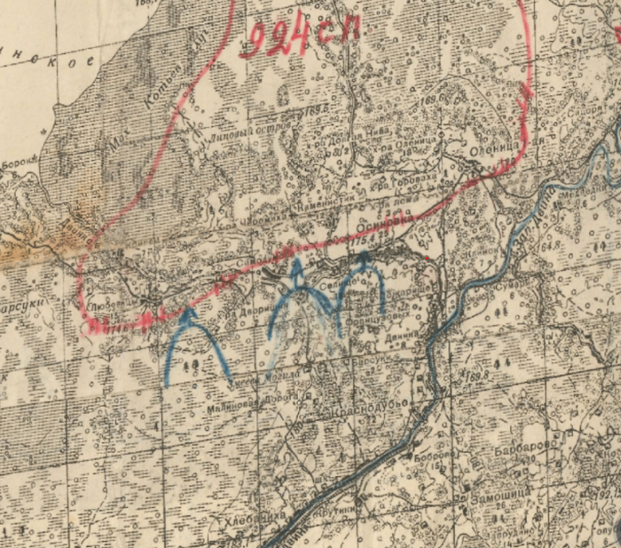 Обратите внимание на то, что противостоящий противник на обстановку не нанесен. Это свидетельствует, что доразведка перед планированием наступления не проводилась. Дивизии были брошены с марша в бой. Это позволило достичь тактической внезапности и потеснить противника, но расположение артполков противника вскрыты не были. Поэтому не подавленная артиллерия противника и минометные батареи смогли нанести серьезный урон наступающим.