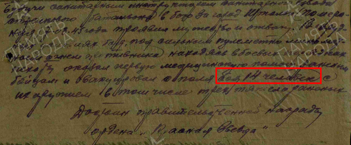 Мой дед, высокий и сильный 23-летний красавец-мужчина, будучи под сильным пулеметно-минометным огнем противника, находясь в боевых порядках пехоты эвакуировал с поля боя 14 солдат и офицеров с их оружием. В том числе 3 тяжело раненых.